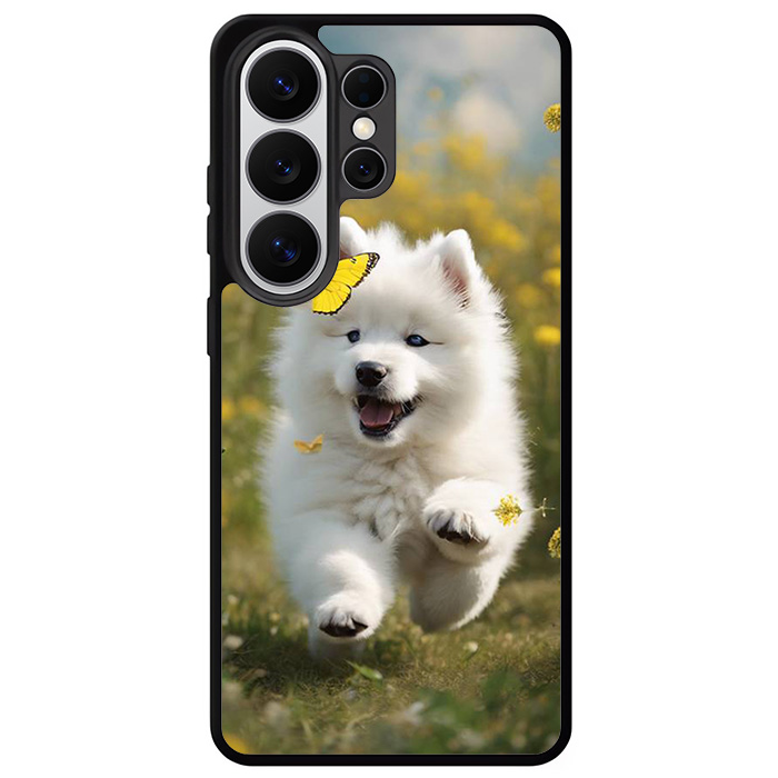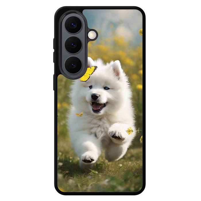 Cute puppy catching butterfly Samsung Galaxy S26 Series Case designed with modern form and function in mind. This premium-durable cases protect your phone in every situation while being very light. The surface is perfect for high quality prints, making it a must-have style accessory.